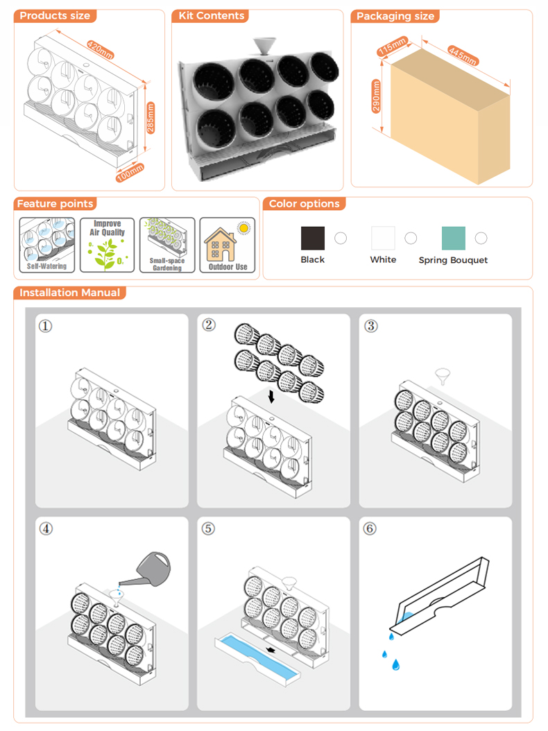 Pixel-Garden Kit 42*28.5*10cm ,3″inner pot*8, Funnel*1,Tidy bag*8 It can be your herb garden or your succulent wall or a bed for new vegetable starters, ease and beauty packed in one.