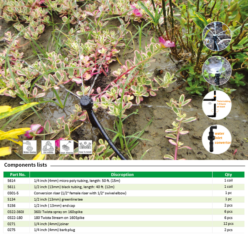 This easy-to-install kit is perfect for beginners and ideal for watering vegetable gardens, flower beds, and lawns. The kit includes two nozzles offering different spray patterns: