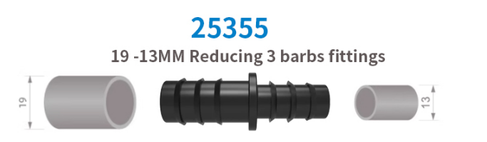 (0508-2)13mm Joiner 3 barbs-10PCS, (0508-3)19mm Joiner 3 barbs-10PCS, (0509-2)13mm Elbow 3 barbs-10PCS, (0509-3)19mm Elbow 3 barbs-10PCS, (0510-2)13mm Tee 3 barbs-10PCS, (0510-3)19mm Tee 3 barbs-10PCS, (177)3/4" adaptor- 13mm barb 3 barbs-10PCS, (178)13mm-3/4" Direct-Male 3 barbs-10PCS, (179)13mm-3/4" Male Tee 3 barbs-10PCS, (180)13mm End Plug 3 barbs-10PCS, (25355)19-13MM Reducing 3 barbs-10PCS